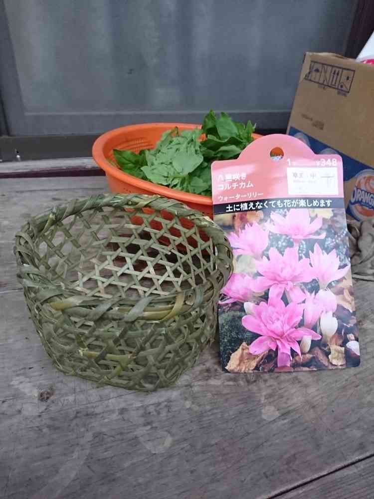 竹カゴにコルチカムの花が咲くのを楽しみにしています♬