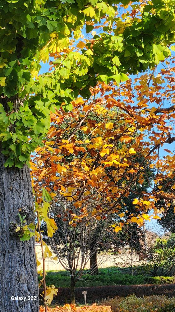 紅葉したカエデと緑色のイチョウの葉が揺れる青春🍁‼️