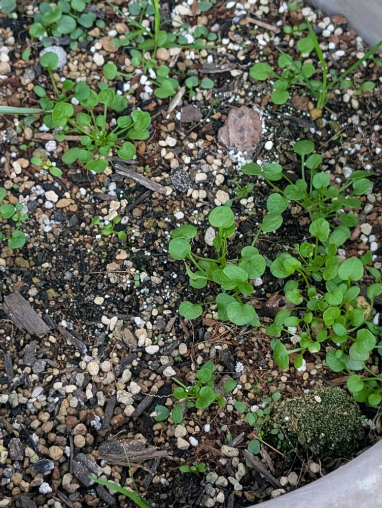 イオノプシジウムのこぼれ種が発芽して、たくさん芽を出し、喜んでます