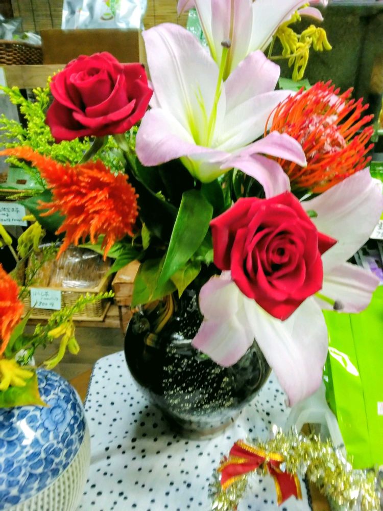 イベント シャンソンコンサート見に行きました おみやげにお花バラに大きな百合などで良い香り