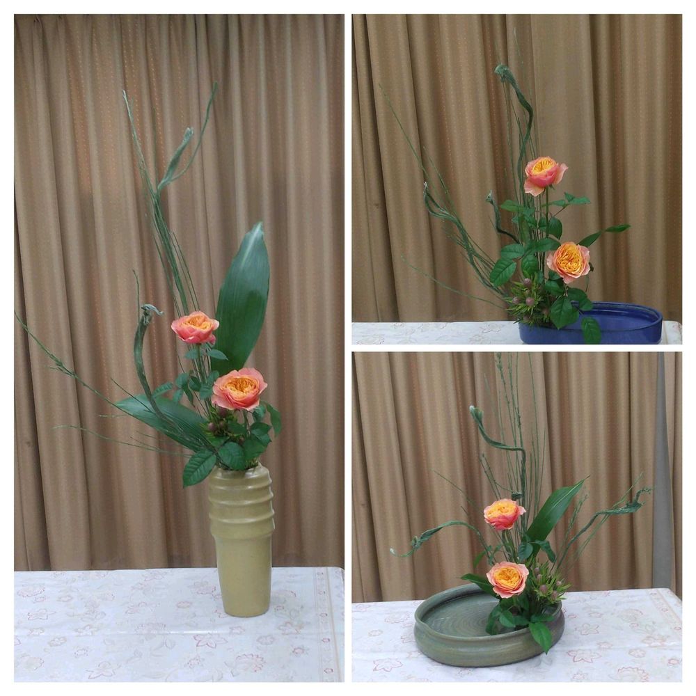 ディスパットのお菊さんの予定がお店の都合で薔薇になりました 石化エニシダ、ルーコライムグリーン、ハランで直立型を生けました。