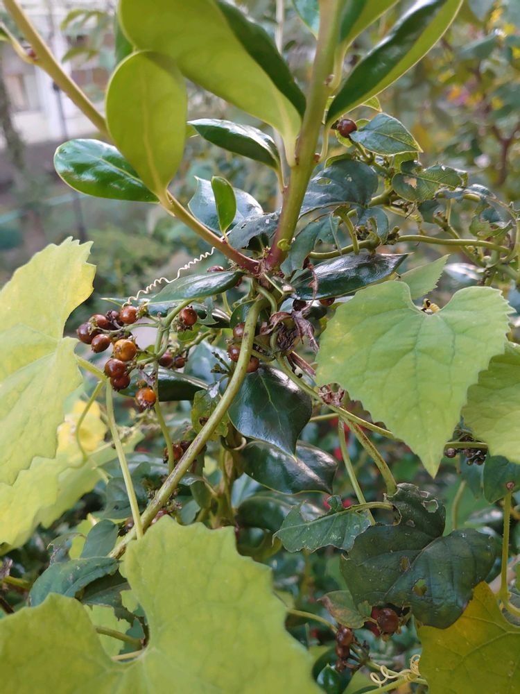 5️⃣アカメガシワの枝に絡み付くヘクソカズラと🟤後ろにヤバネヒイラギモチの実🔴😊