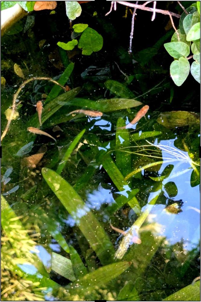 2日目の今日の朝 先住者の黒メダカと元気に泳いでいました 寒さ対策は必要かなぁ〜?p3p4 水瓶の周りはウォーターコインとプミラで暑さ対策はバッチリ?でしたよ