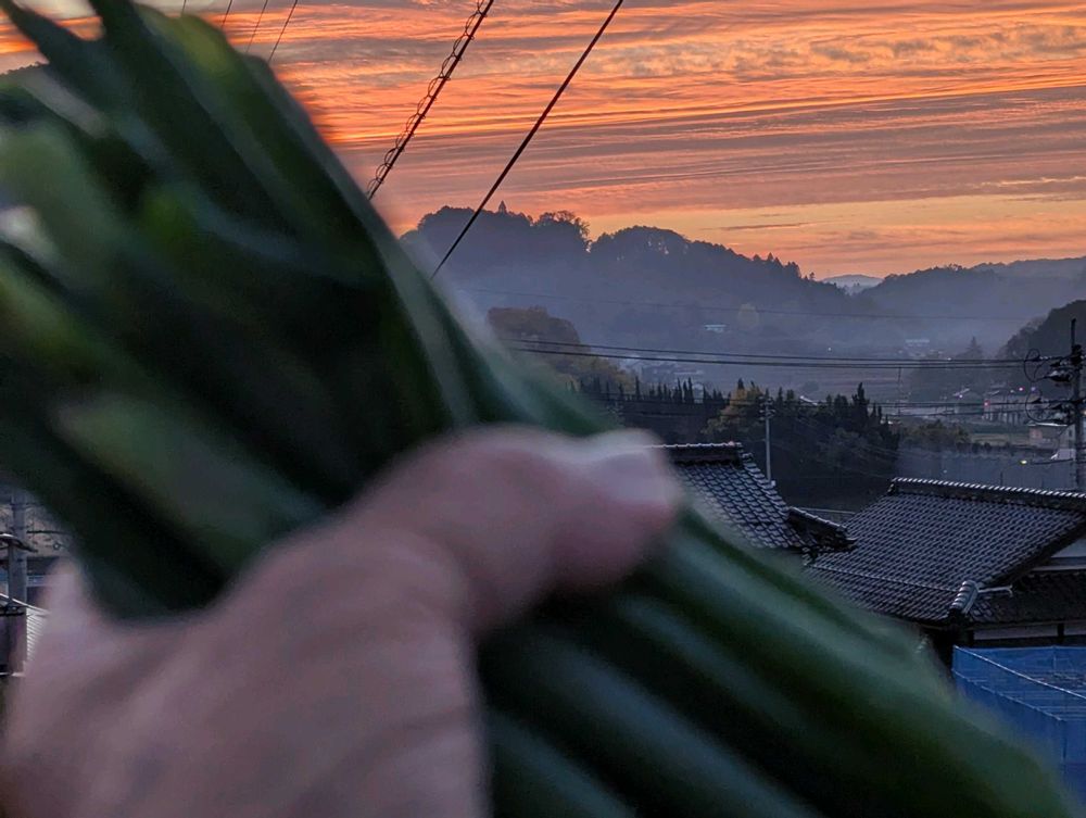 11/18.気温7度、寒い朝〜作東の朝焼けの空〜ネギを収穫空と📱パシャリ