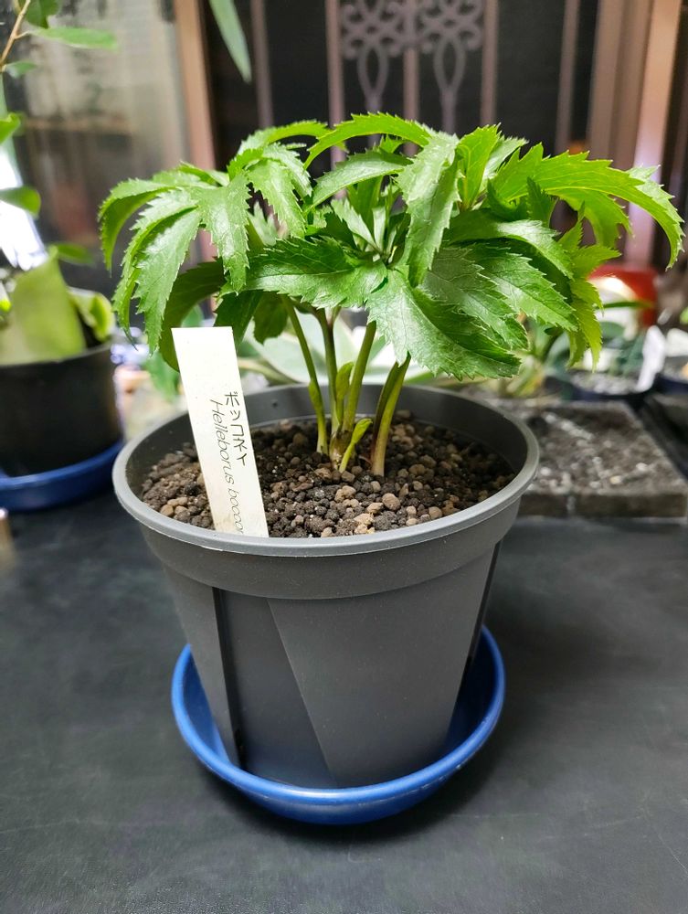 3.5寸鉢が変形してたので植え替えた原種クリスマスローズ、ボッコネイ。
