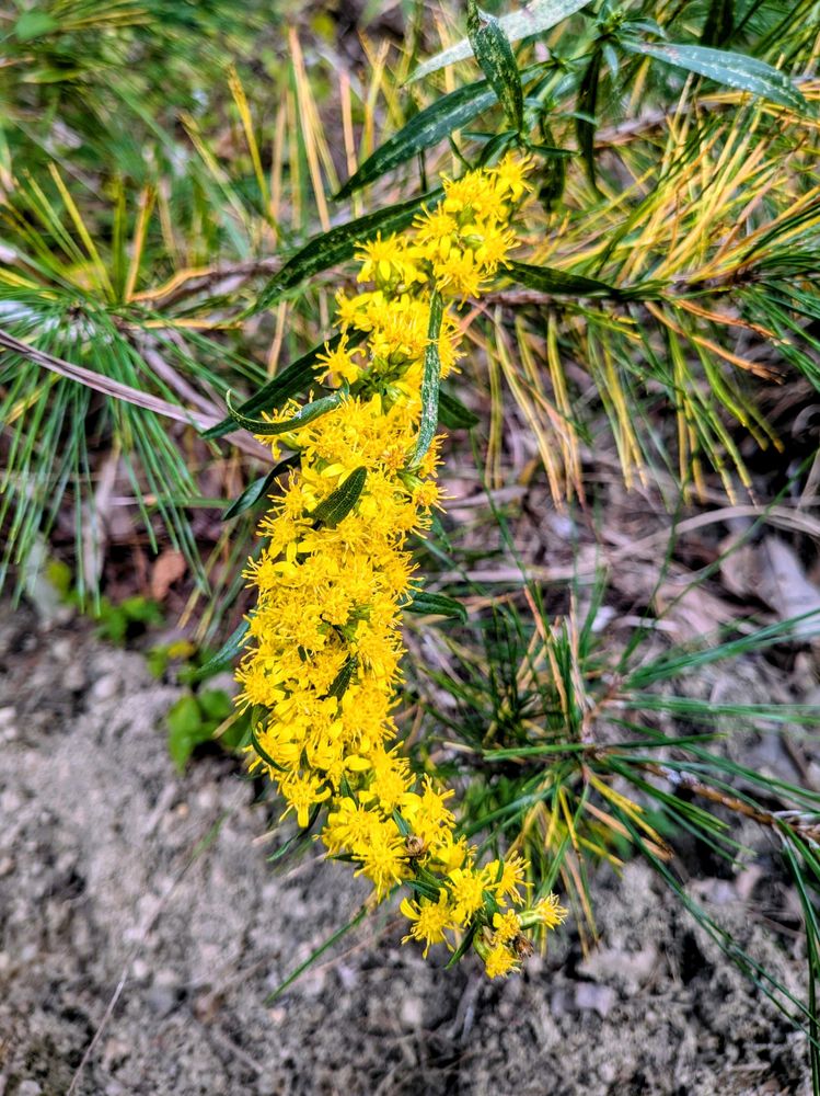 ③松の枝にゴロリと横になっていたアキノキリンソウは30㎝くらいの長さ。