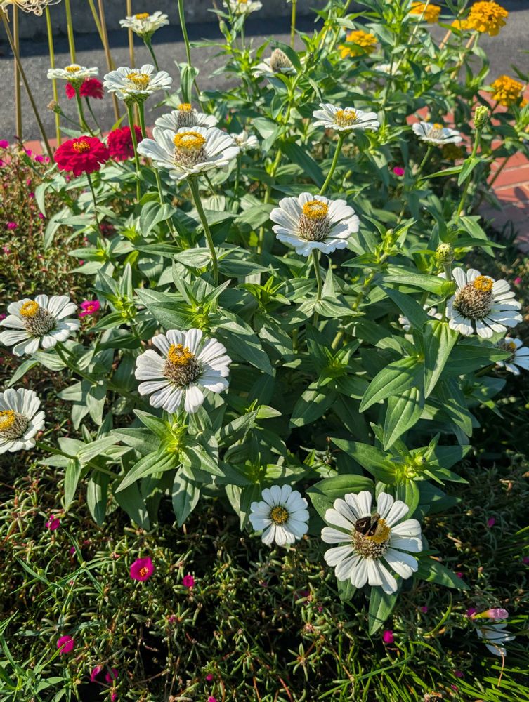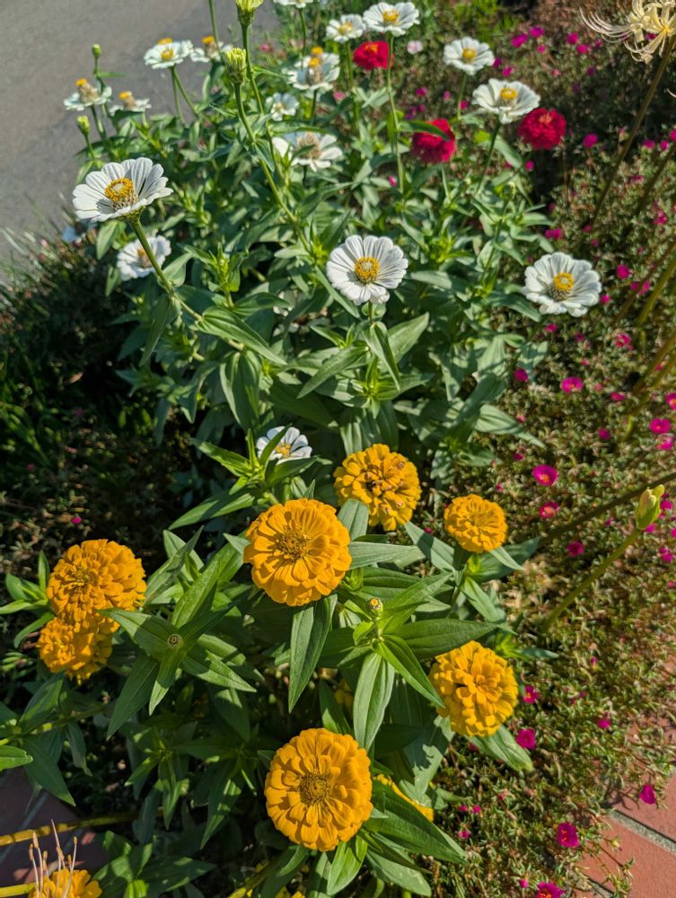 ちょっと前の写真ですが、うちの花壇の白い彼岸花、百日草、マツバボタンです