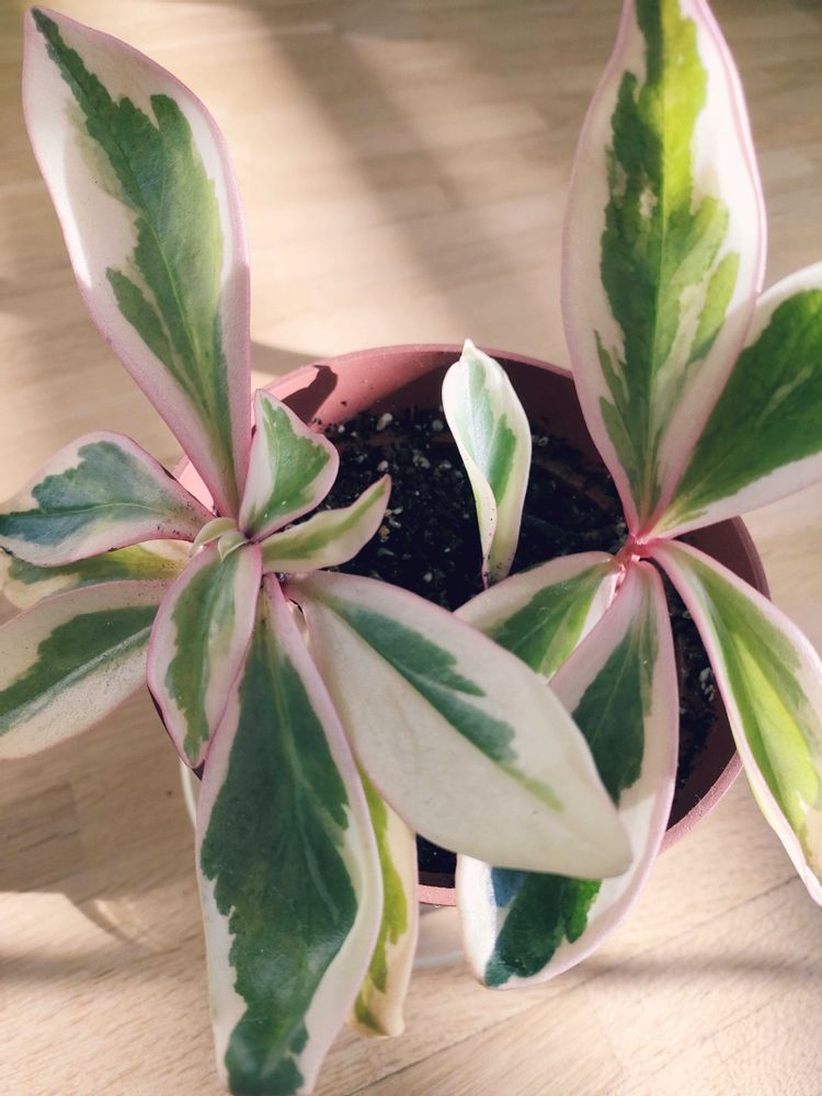なんと前回(2020.10pic)から5年もpicしていなかったペペロミア。というのも小さい鉢のままずっと放置していて💦ようやく今春植え替えたところ、ゆっくりと新芽が育ち始めました。印象的にはホヤ リップカラーとよく似た色構成💚🤍🩷