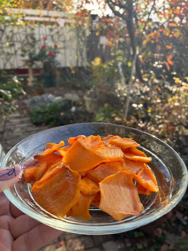 先日ご近所さんから渋柿をいただきました。もちろんそのままでは食べられないので、スライスして天日干しにし、ドライフルーツにしてみました💕