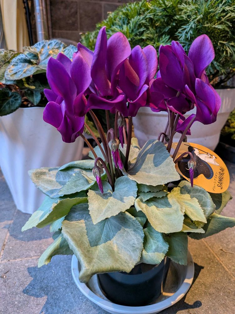 高くて買えない月下…dcmのチラシに大栄花園のシクラメン入荷を見つけ現場監督ほったらかしてすっ飛んでいった💨サムライのタグがついた5鉢くらいの中にシルバーリーフ✨すぐにカゴにイン💕江戸の青とか胡蝶とか月下はもっと大きく育てたものなのか⁉️小さいうちはサムライとして出荷してるのか🤔去年かった江戸の青らしいのは夏越しに失敗して跡形もなし😂これは大事に育て月下✨にしたい🤭
