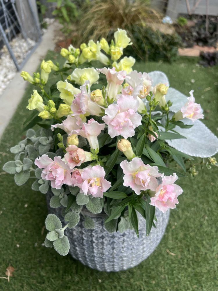 グリーンっぽいキンギョソウ、シルバーリーフたちと寄せ植えにしました🪴