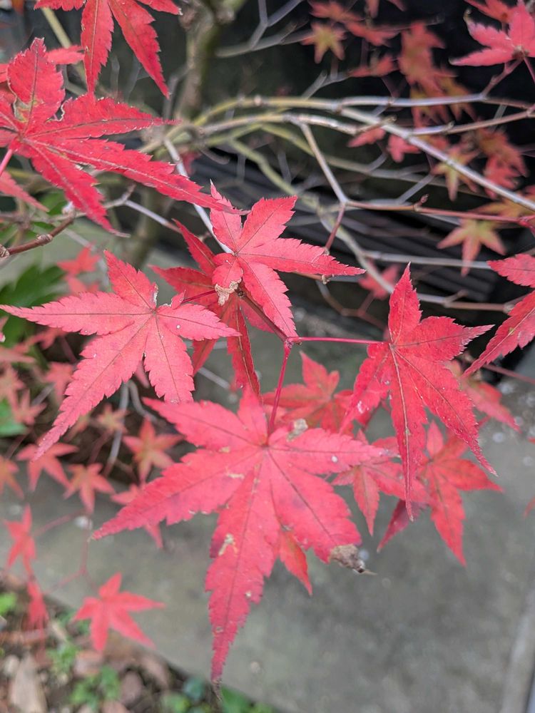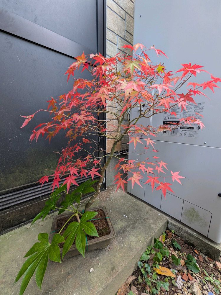 庭に実生で生えてきたものを鉢に植え替えて盆栽風に育てているモミジが綺麗に紅葉しました。