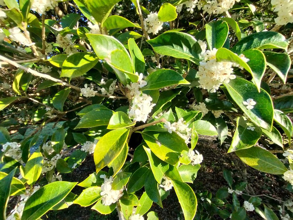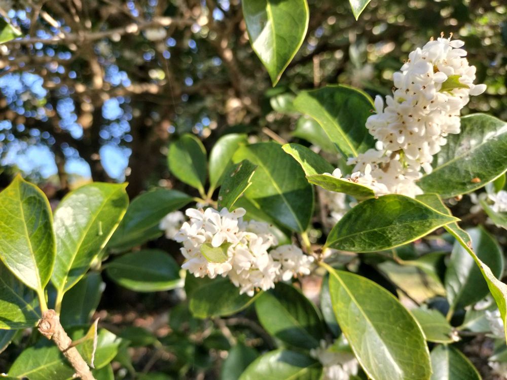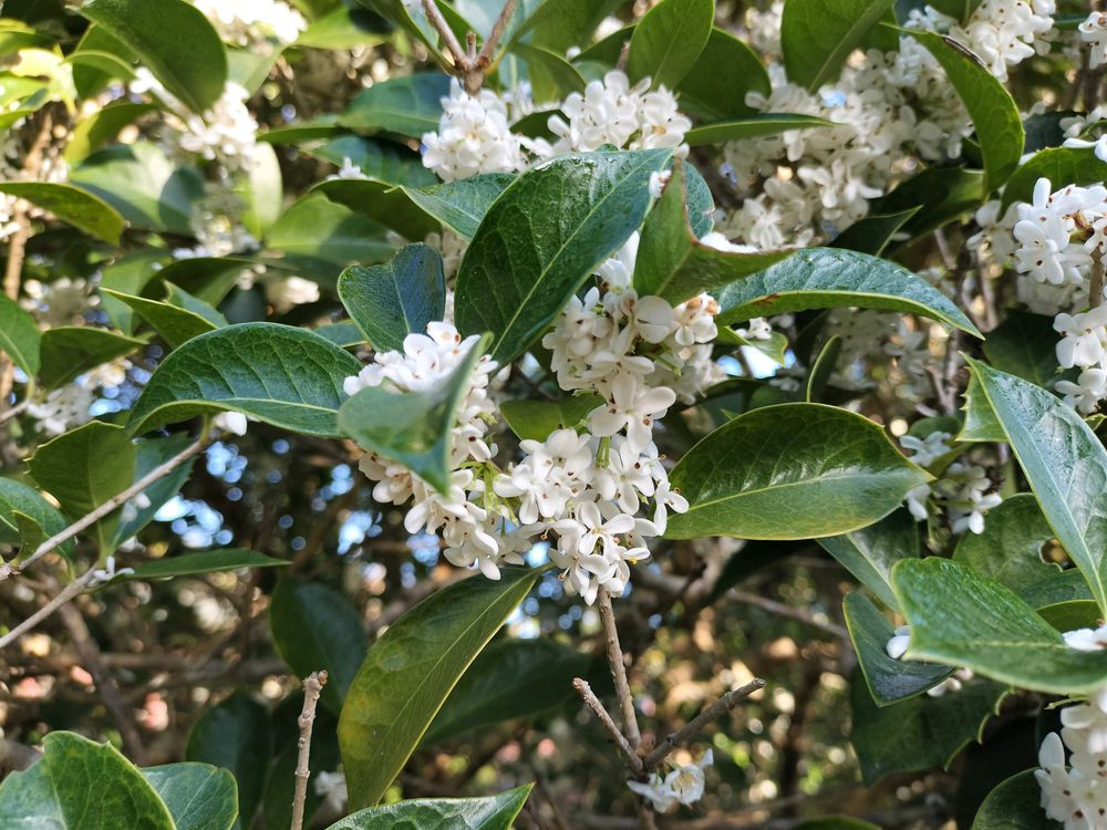 この時は葉の形に気づいていなくてヒイラギモクセイとギンモクセイだと思っていなくて香りの違いを確認できませんでしたが、帰ってきて写真を見たら葉の形が違いました。