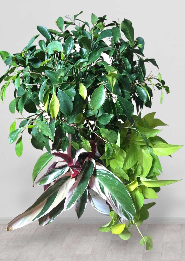 斑入りのベンジャミンの足元にウラベニショウやポトスがはいてました…
