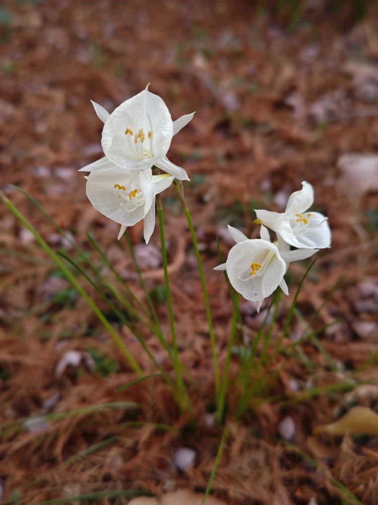 今日のお花の、スイセン(2025/2/7撮影)。ラクウショウの落ち葉の中の、原種スイセン モノフィラス📛(再投稿)です。