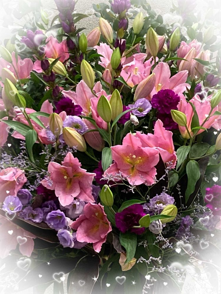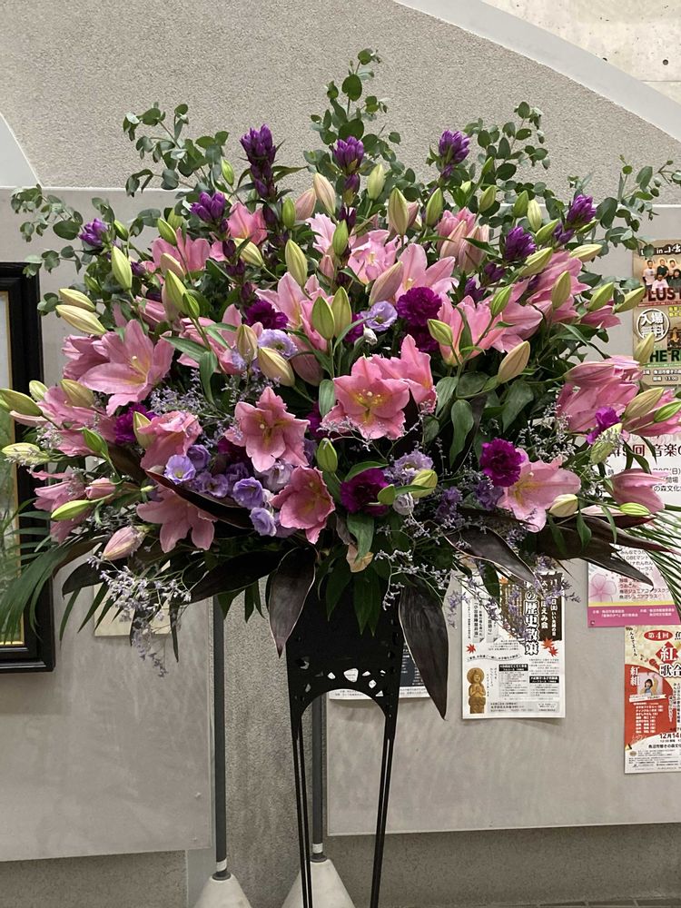 文化会館に飾られていた地元のピンクのユリのアレンジメントでお祝いさせてくださいね