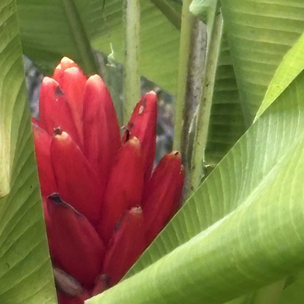 バナナの葉っぱ🍌みたいななかで真っ赤なお方が、、。(ヒメバショウかもと思います。🔍)