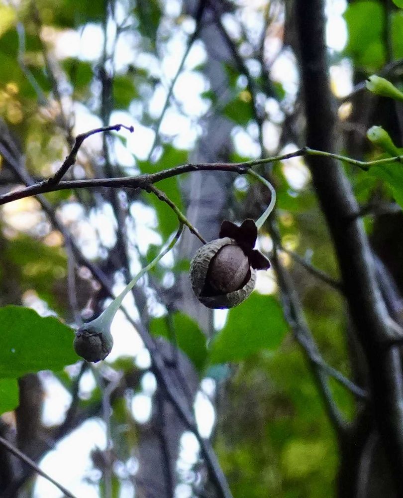 エゴノキの果実、最初は薄い緑色や灰白色をしており、8月から10月頃にかけて成熟すると茶色く変色し、果皮が縦に裂けて中にある黒っぽい種子が現れます。