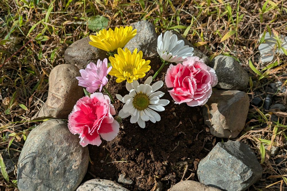 しーちゃんバッタサンはしーちゃんの代わりにやって来てくれましたからお墓を作りました 🌸はしーちゃんのお供え花を飾りました💐😊🙏