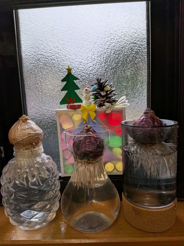 3️⃣ヒヤシンス🪻段ボール📦️から1週間ぶりに出してみると根っこが出てました💕嬉しい🙆