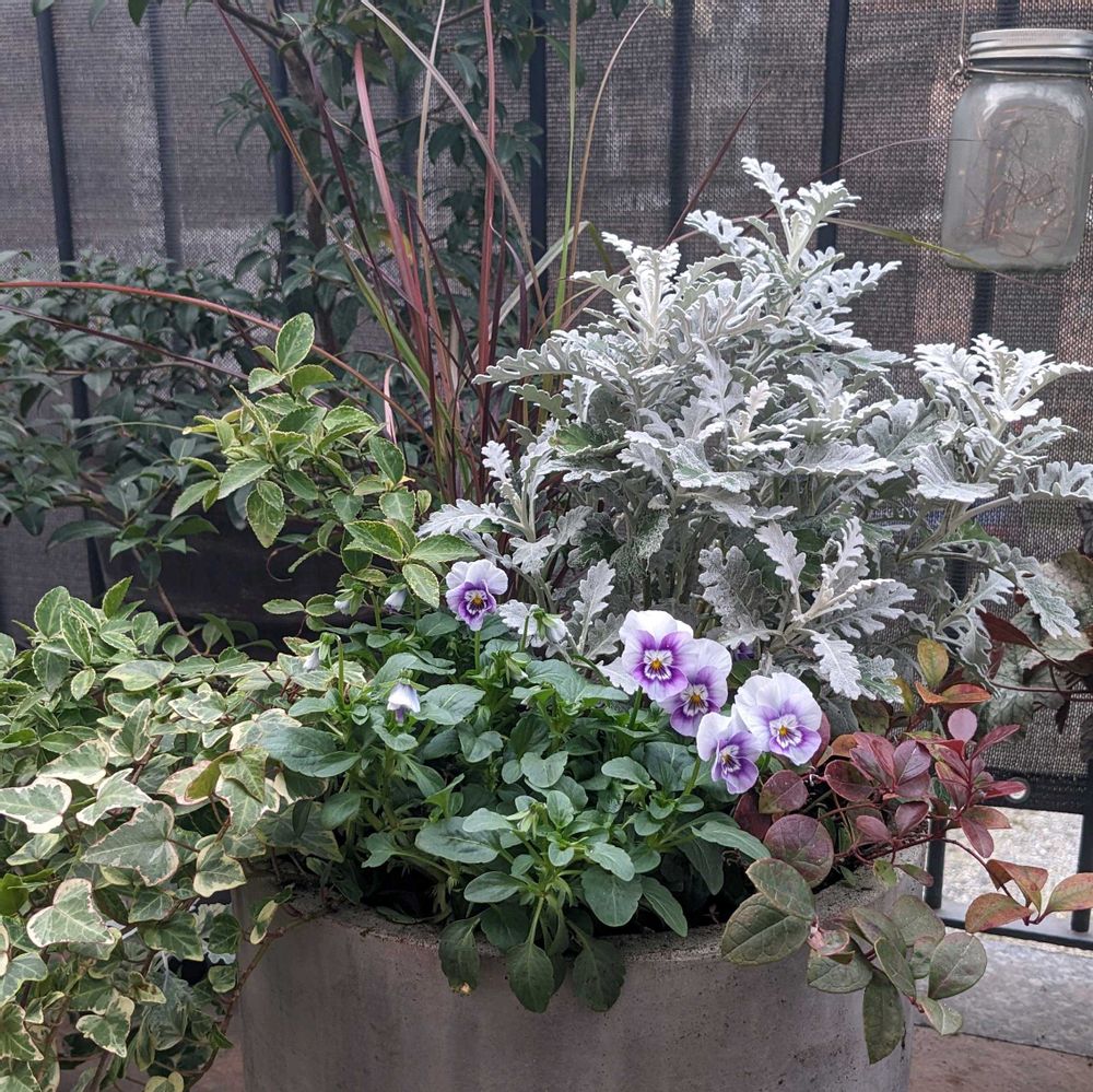 ①毎年ビオラだけ植えなおしてる鉢。シロタエギクの成長に圧倒され、他のこのスペースを確保するのに一苦労。