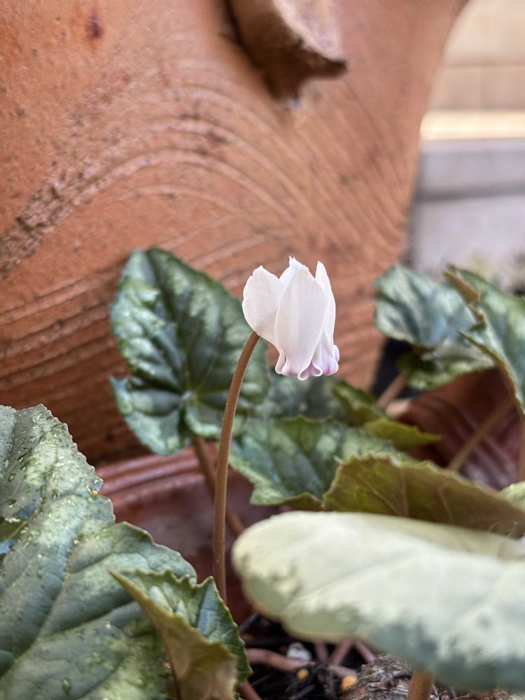 咲いてから時間が経ってシクラメンらしい咲き方になってきました。花の中心がうっすらピンクに💕