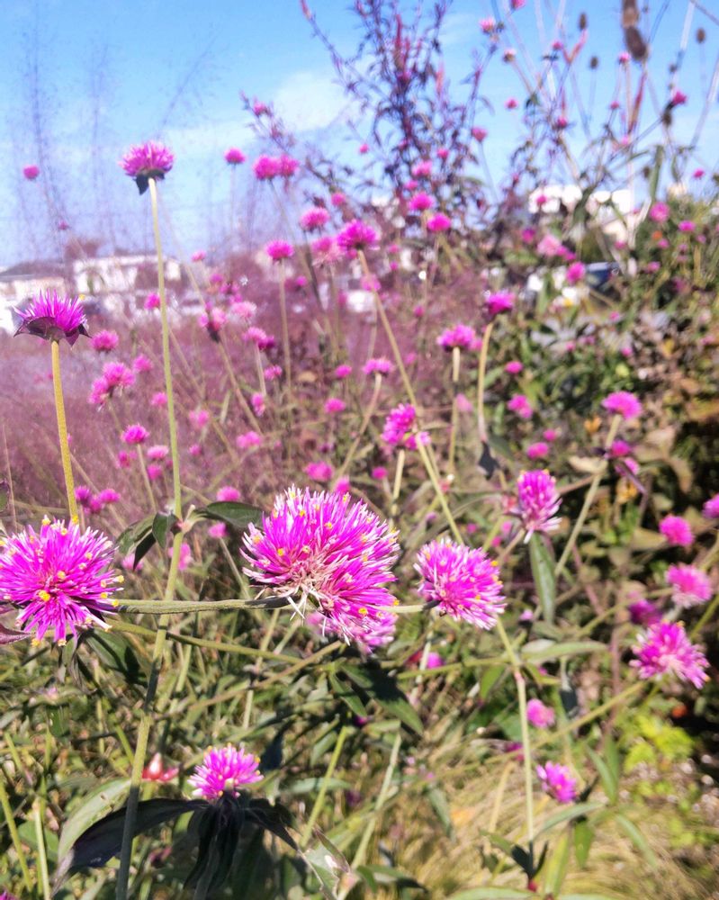 ① 千日紅が、ピンクミユーリーグラスの中に混じりあって咲いていて、とても綺麗でした🌸
