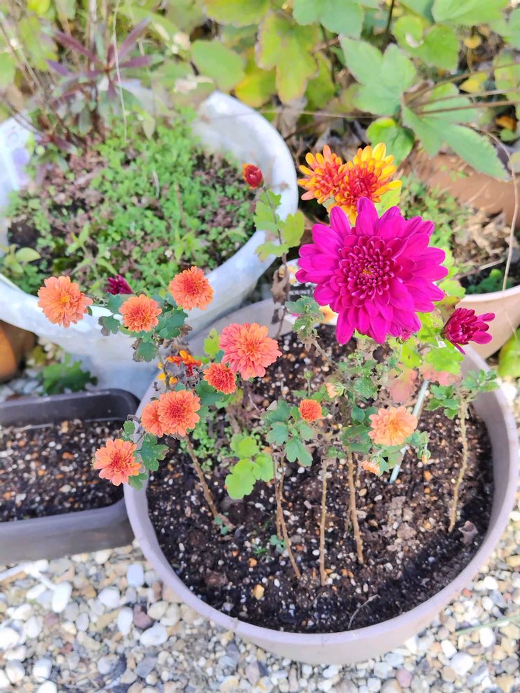 ③3つの鉢に少しずつ咲いていたクリサンセマムを一鉢にまとめました❇️🧡💛💗❇️