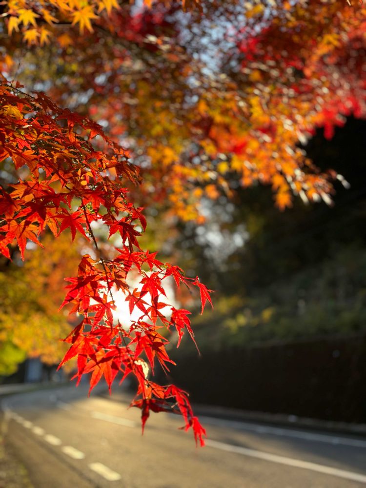 夕陽に映えて綺麗なもみじ🍁に立ち止まり。