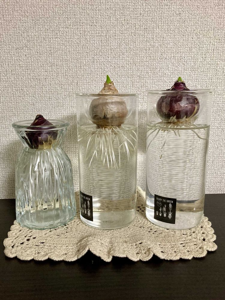 同時にスタートしたのですが、3つの球根の根や芽に成長差があります。