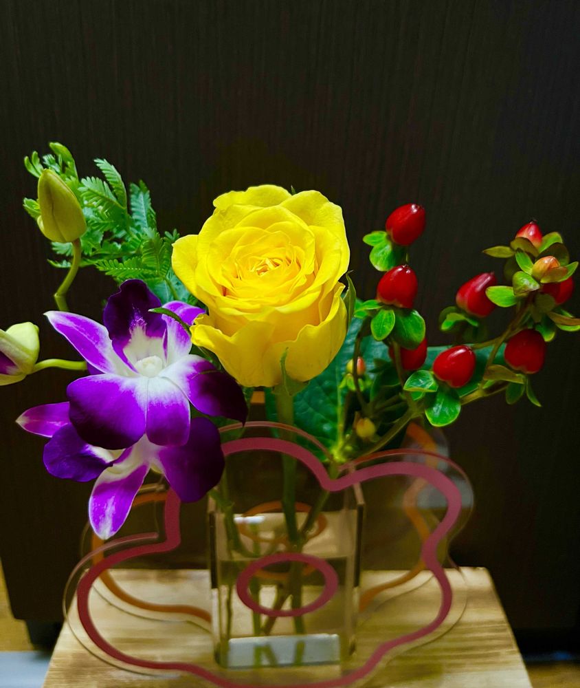💛💚💛薔薇&❤️💚❤️ヒべリカム&💜🌸💜デンファレ&💮💚💮ミモザさん豪華なカルテット💕💖