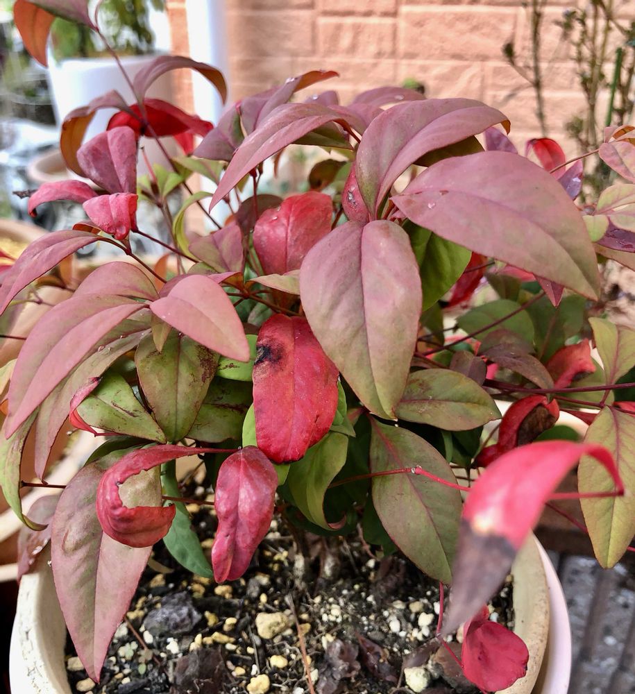 ※我が家の小庭。鉢植え実が付かなかった『 オタフクナンテン 』の紅葉が始まりました。 😁