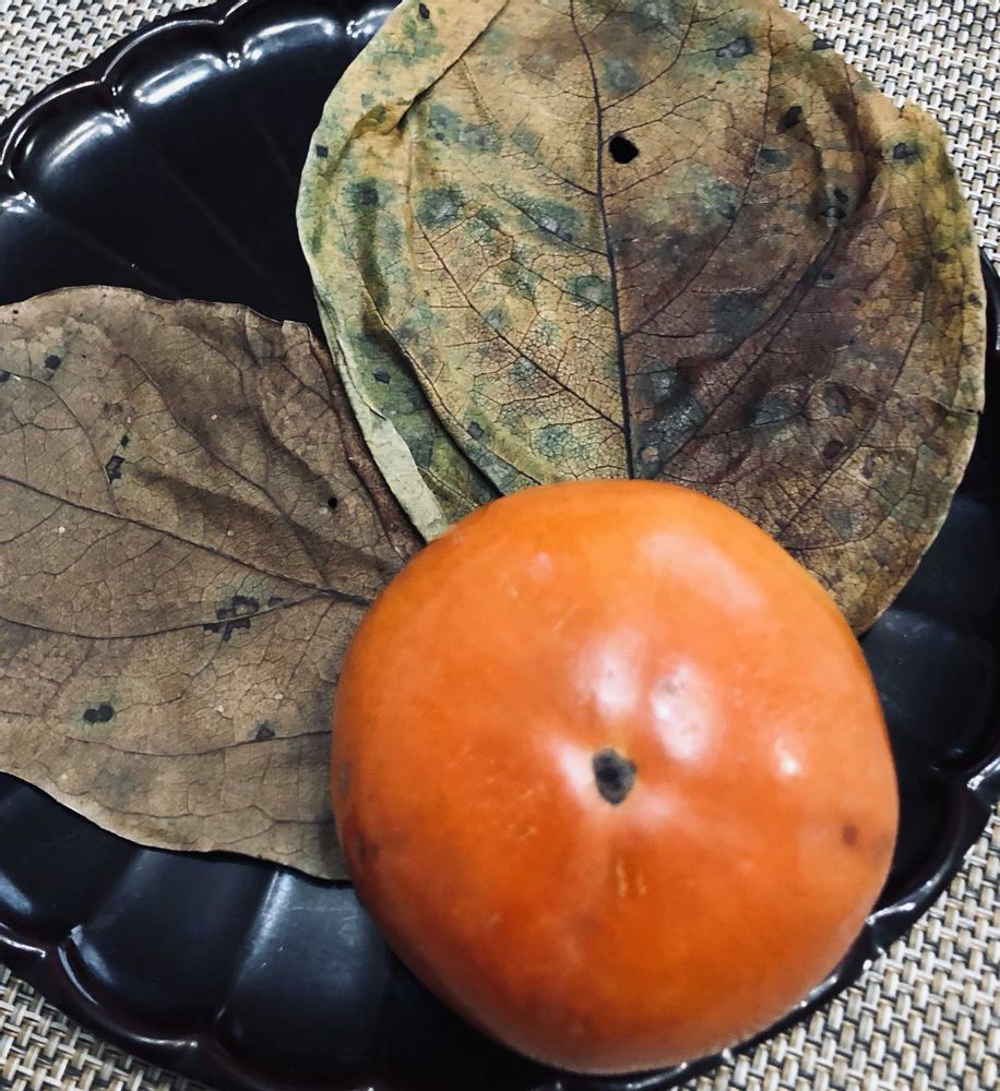 知人さんから頂いた『柿』。その箱の中から『 大きな葉が二枚 』入っていました。 😊