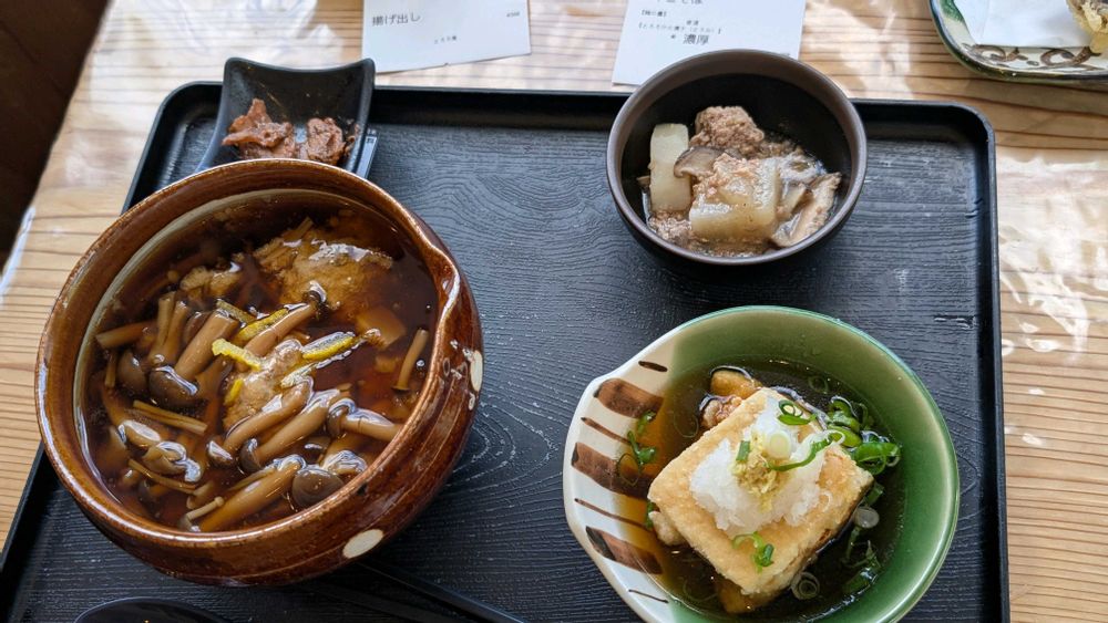 【きのこ🍄とろろ蕎麦】と【椎茸の天ぷら】【自然薯揚げ出し豆腐】を注文🍜