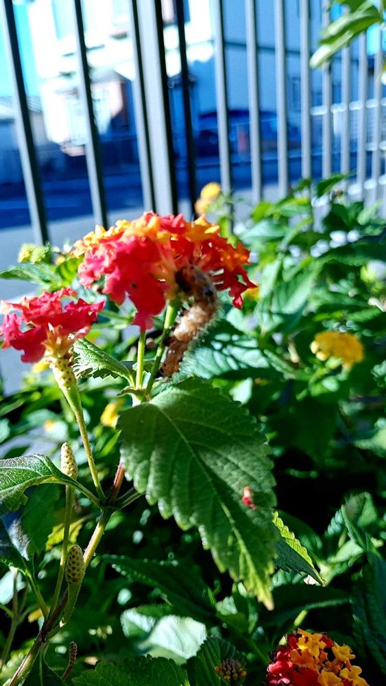 名前は不明やけど、ランタナ🌼を好む毛虫はいるんよ😭