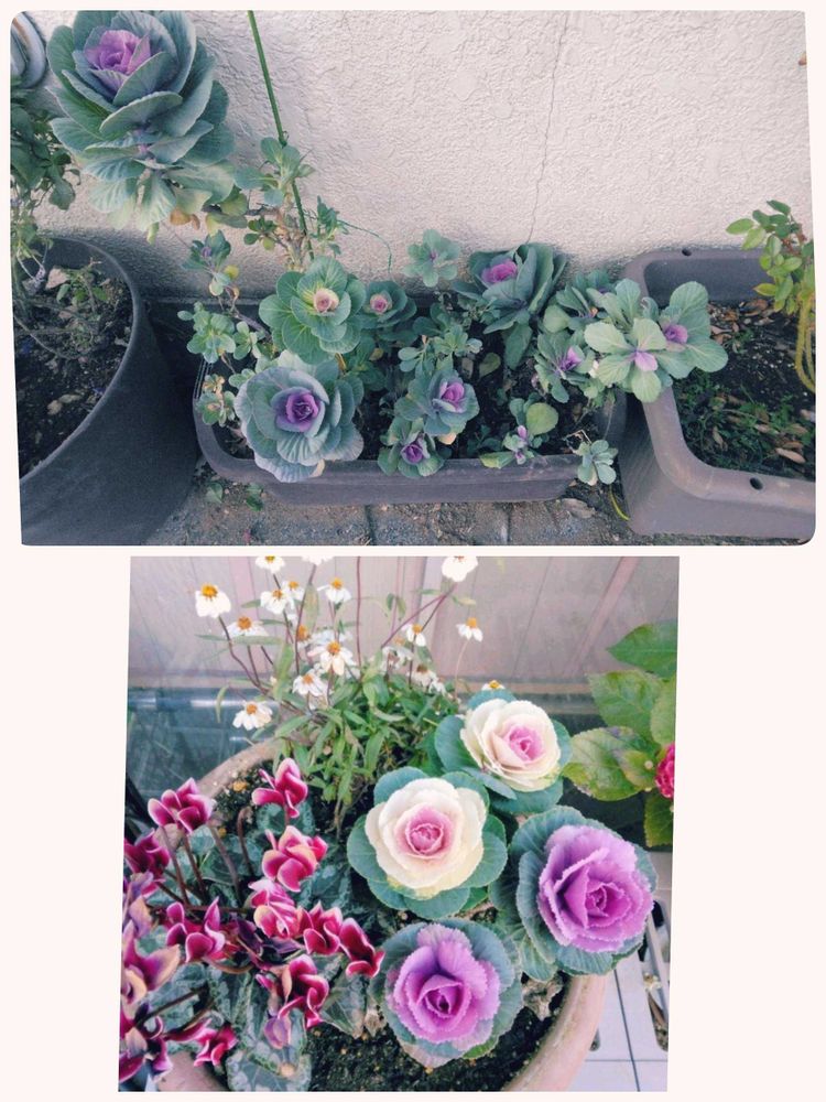 下は去年寄せ植えで購入した葉ボタン 夏を越え菜の花みたいに伸びてましたが切り戻したり挿し木したりどんどん増えてくれました 上が増えた葉ボタン