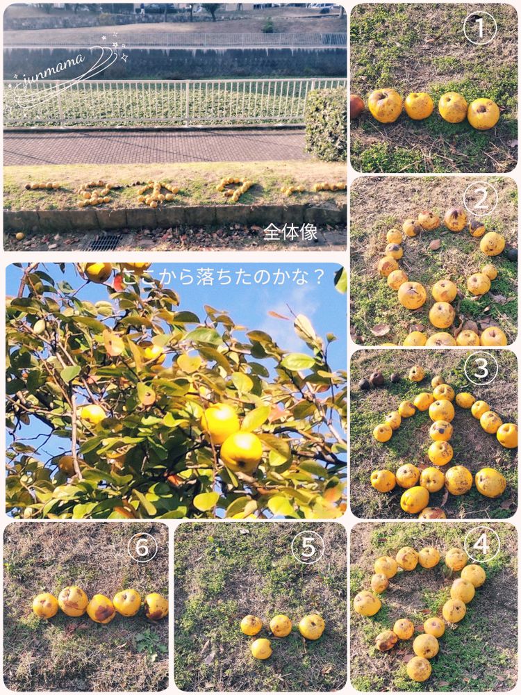 ① 運河公園のマルメロの実 一昨年も今回と同じで 誰かが実を並べてました 謎のメッセージ?😅