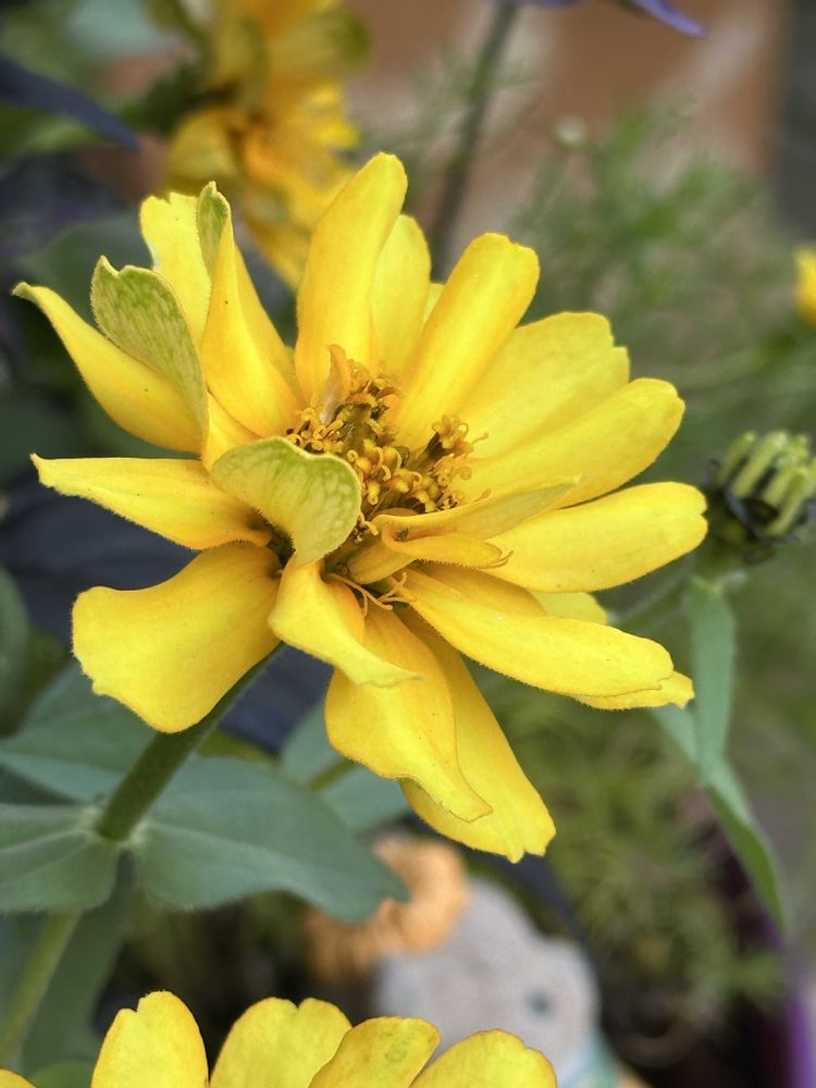 1枚めは、黄色に輝くように咲くヒャクニチソウの小さなお花です。