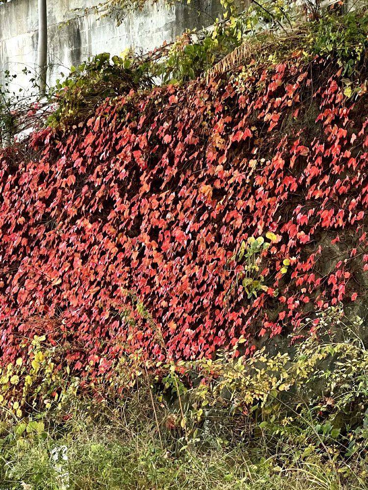御殿場線の線路の向かいの壁に蔦の葉が真っ赤