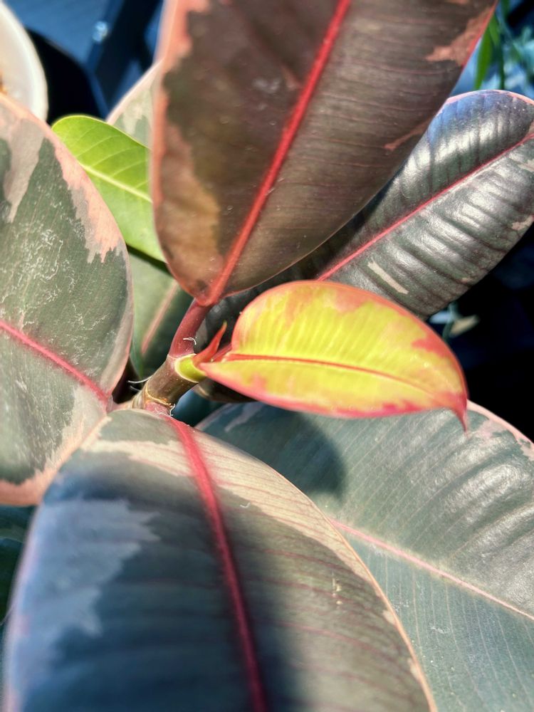 フィカスの新しい葉っぱ、色かわいい〜!!!と撮ってたら他の葉が汚いのに気づいて慌ててクリーナースプレー吹きかけた