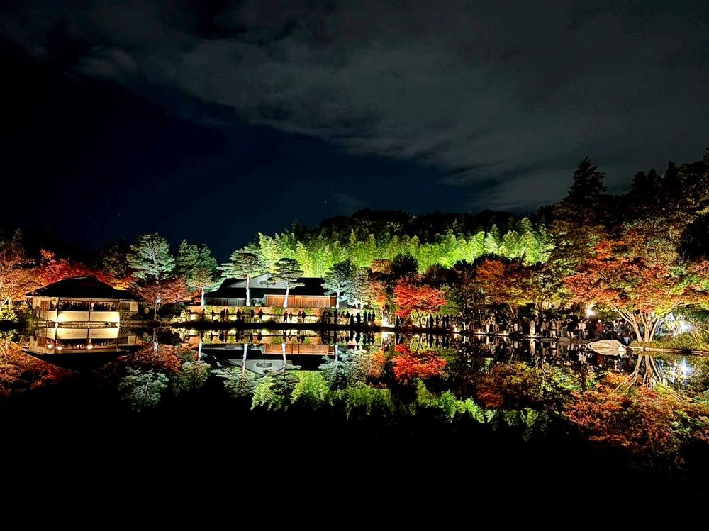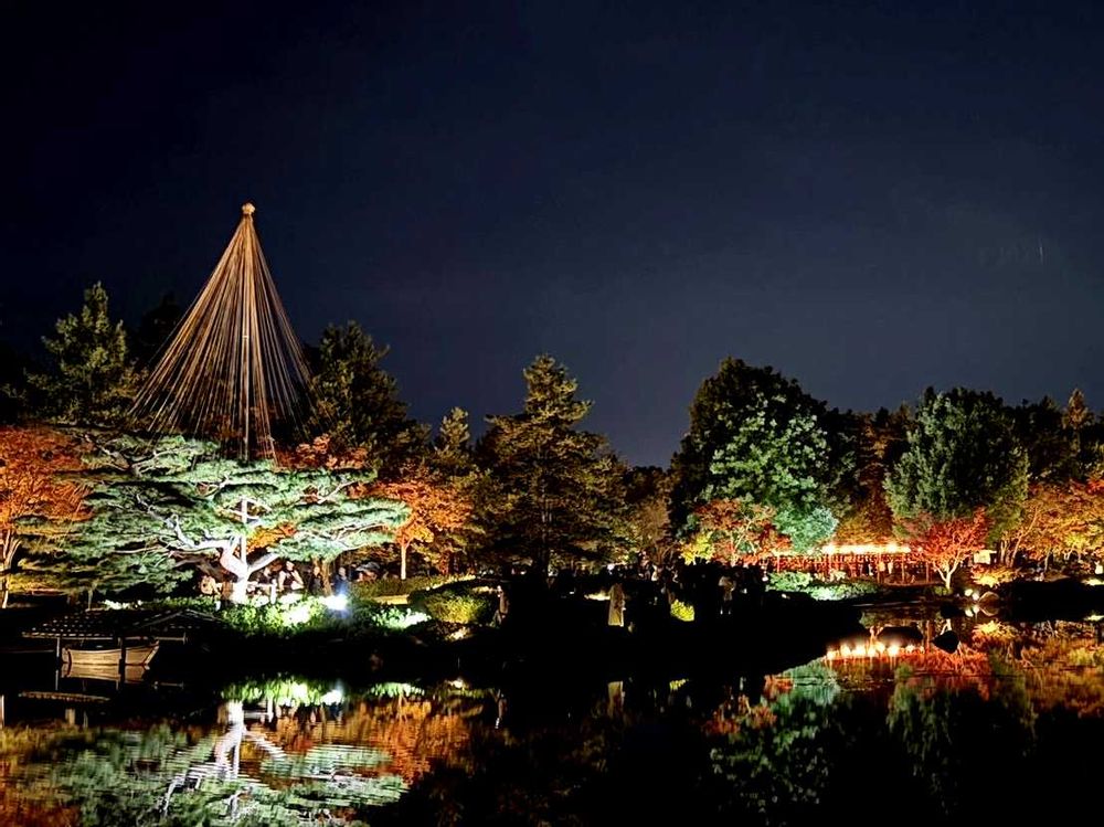 紅葉のライトアップ、日本庭園の池に写る水鏡がとても幻想的で美しい写真でした