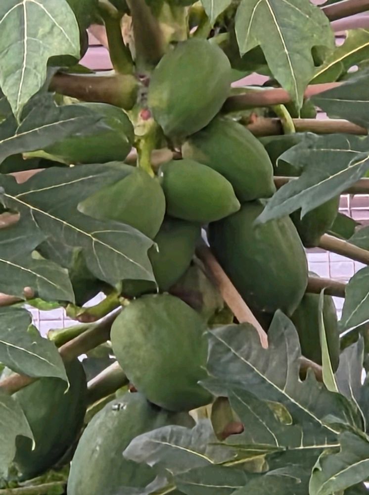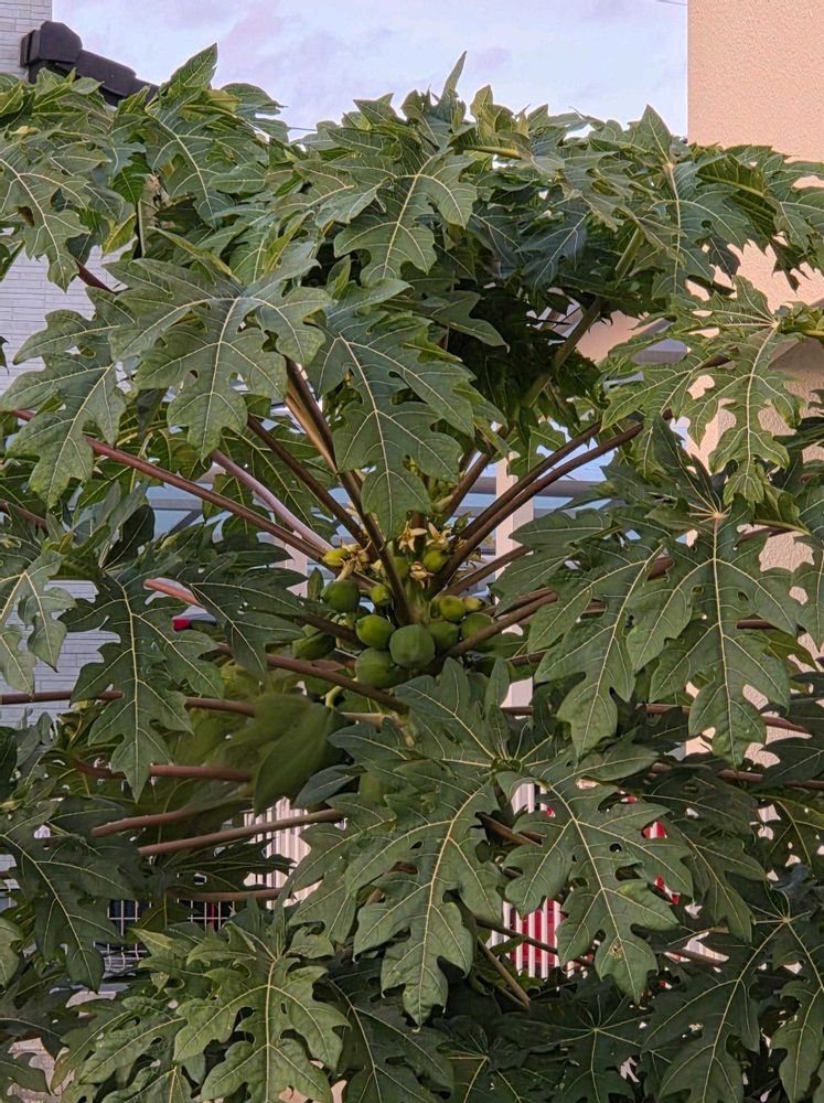 時々稽古帰りに通る道に不思議な大葉に青い果実かなぁ…大きな粒々が調べたらなんとビックリ😵「青パパイア」