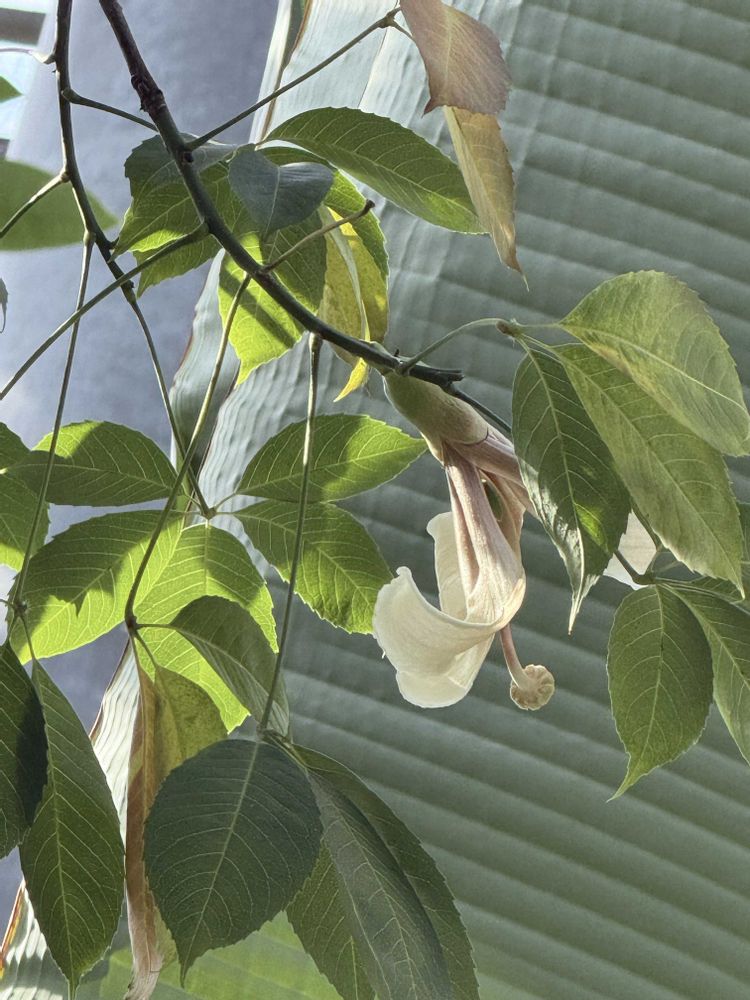 初めて、開花している花を見ましたが、高い葉蔭で見難いです