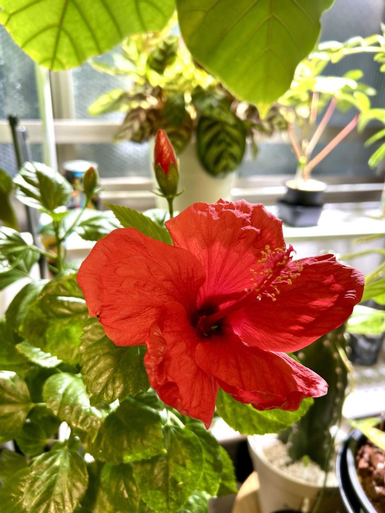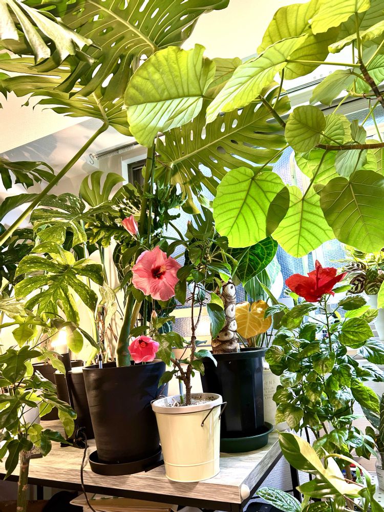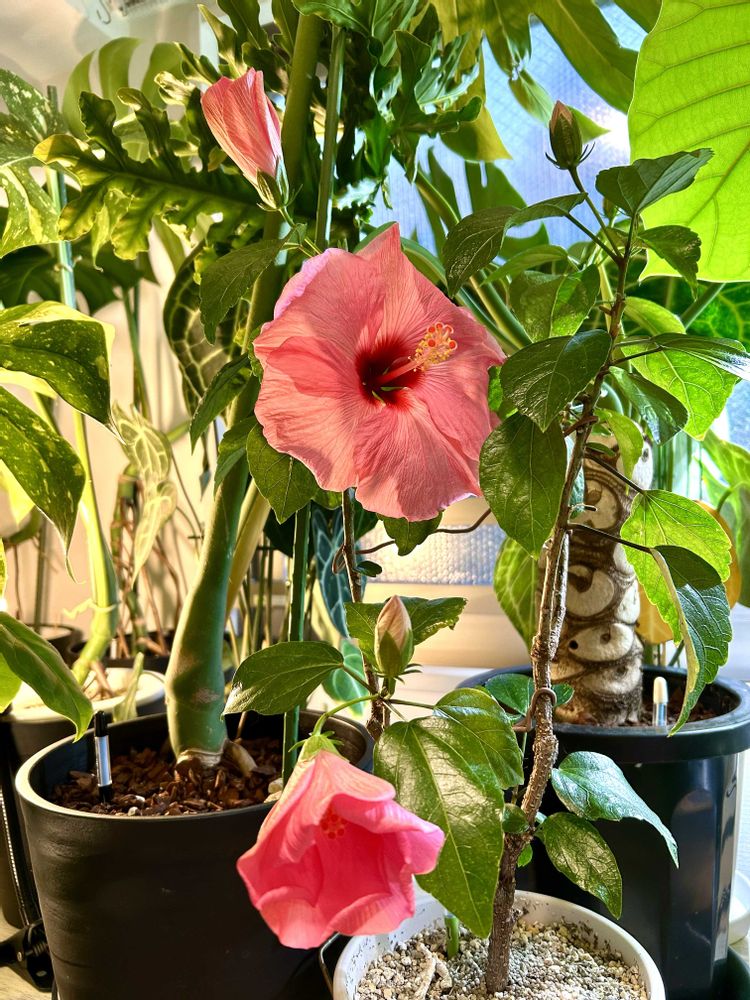 今日のハイビスカス🌺ロングライフシリーズアドニス😊インドアハイビスカスサニーシティ🌺3つ同時に開花しそうです♪♪♪😊