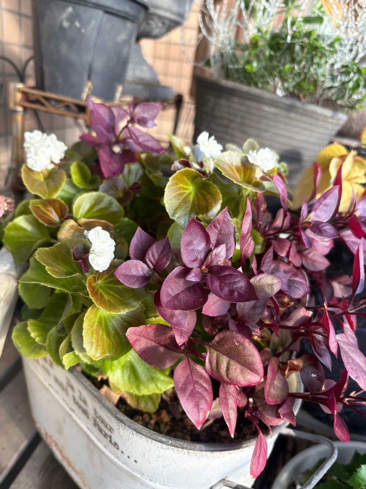 ③挿し芽で増やしたアルテルナンテラとピンクと違ってなかなか咲かなかったホワイトのベゴニアがようやく可愛いポンポン咲きで咲いてくれました🥰