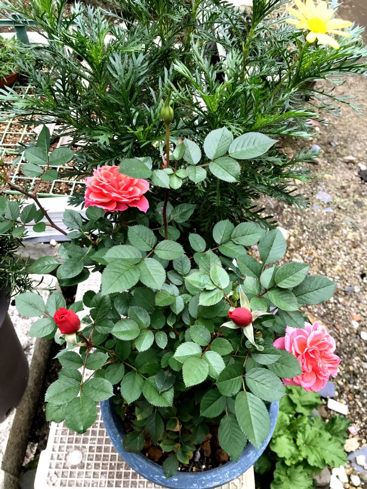 ユリオプスデージーボビ〜暑さ,寒さに強く育て安い四季咲きの薔薇🌹下に見えるグリーンの葉っぱ,こぼれ種の🌸桜そう。