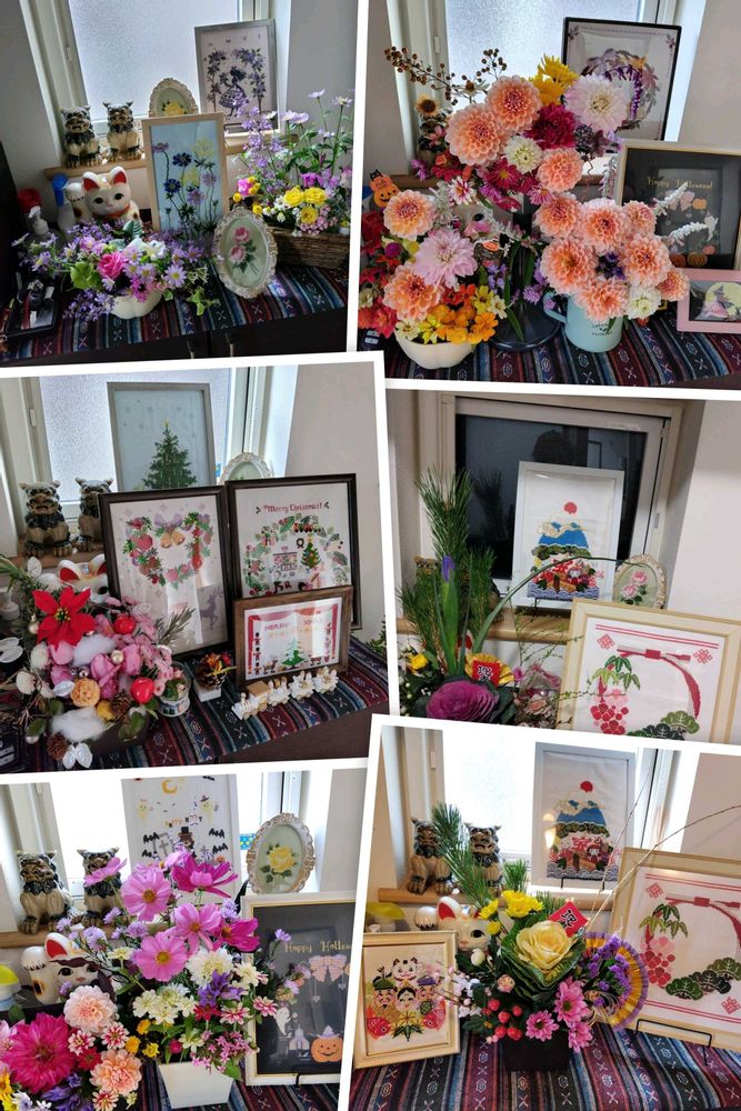 季節ごとに、玄関のフラワーアレンジと刺繍作品を変えています💓