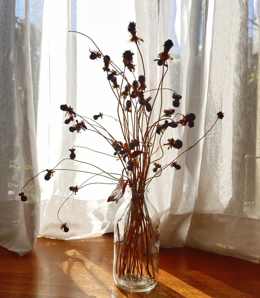 チョコレートコスモスチョカモカのシードヘッドです。数えたら、40輪ほどありました。たくさん咲いてくれてありがとう。ビバーナムのシードヘッドも1輪だけ入ってます。