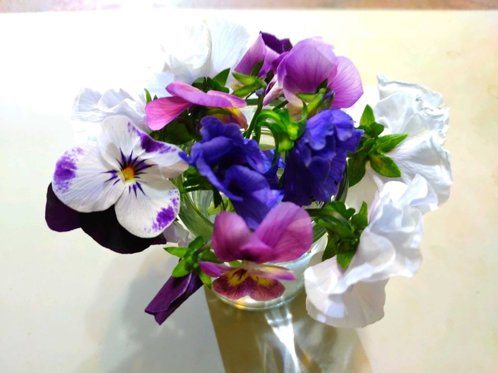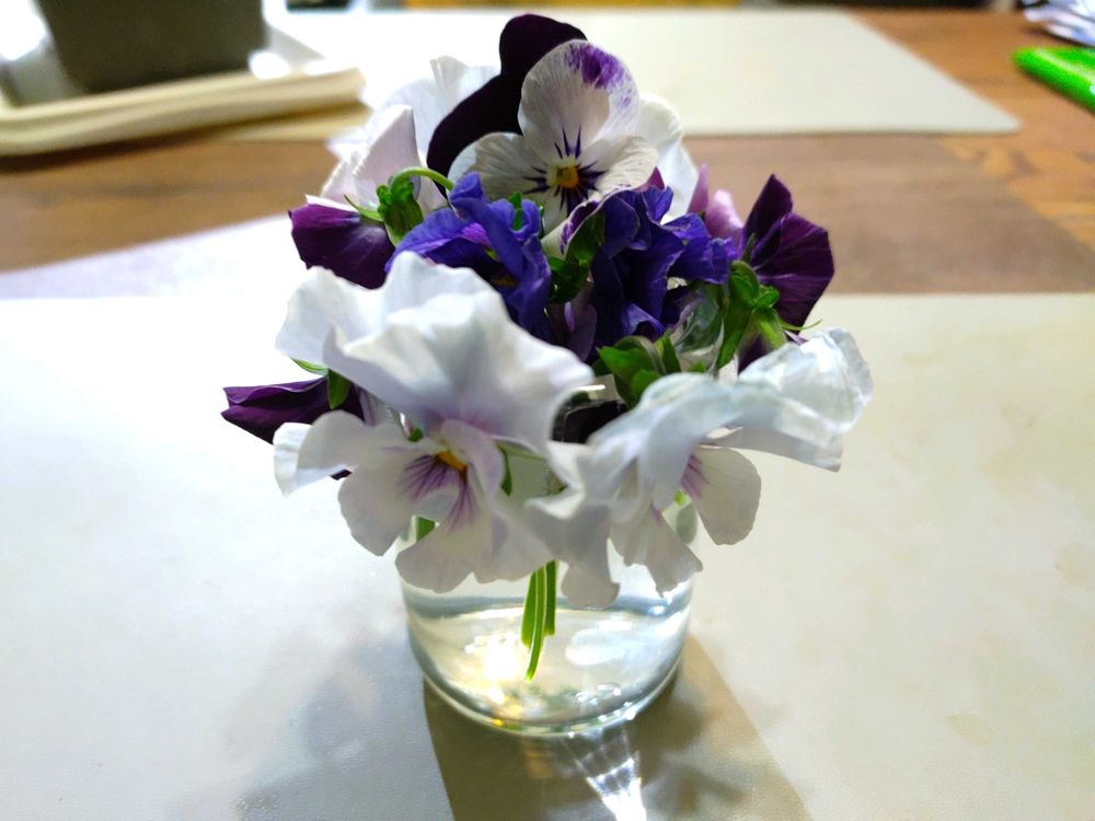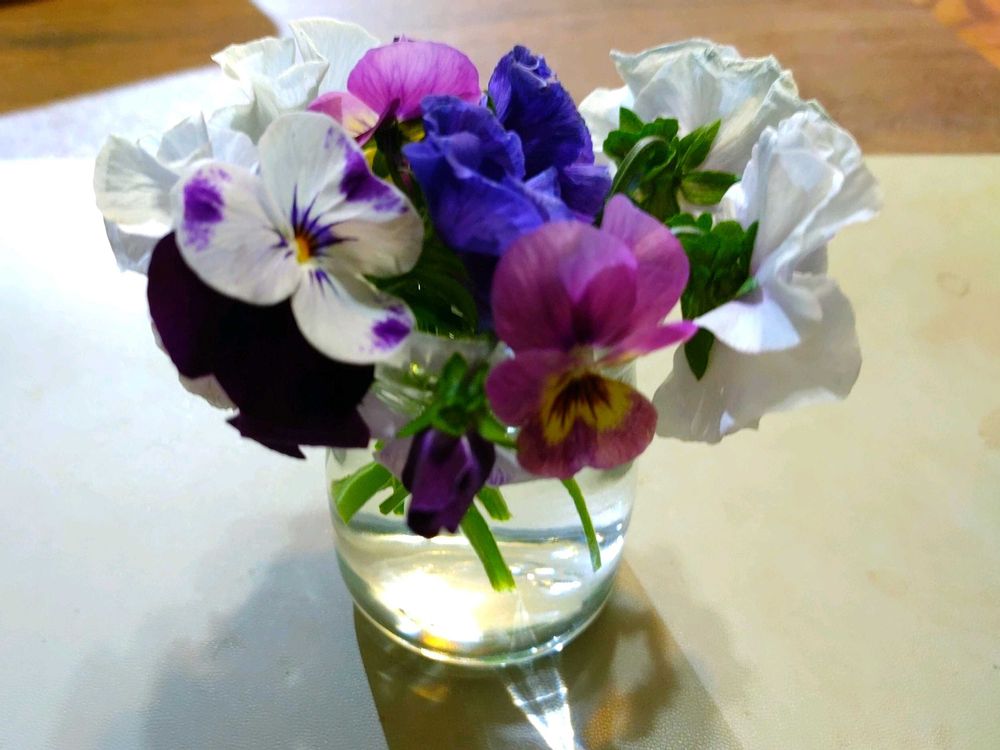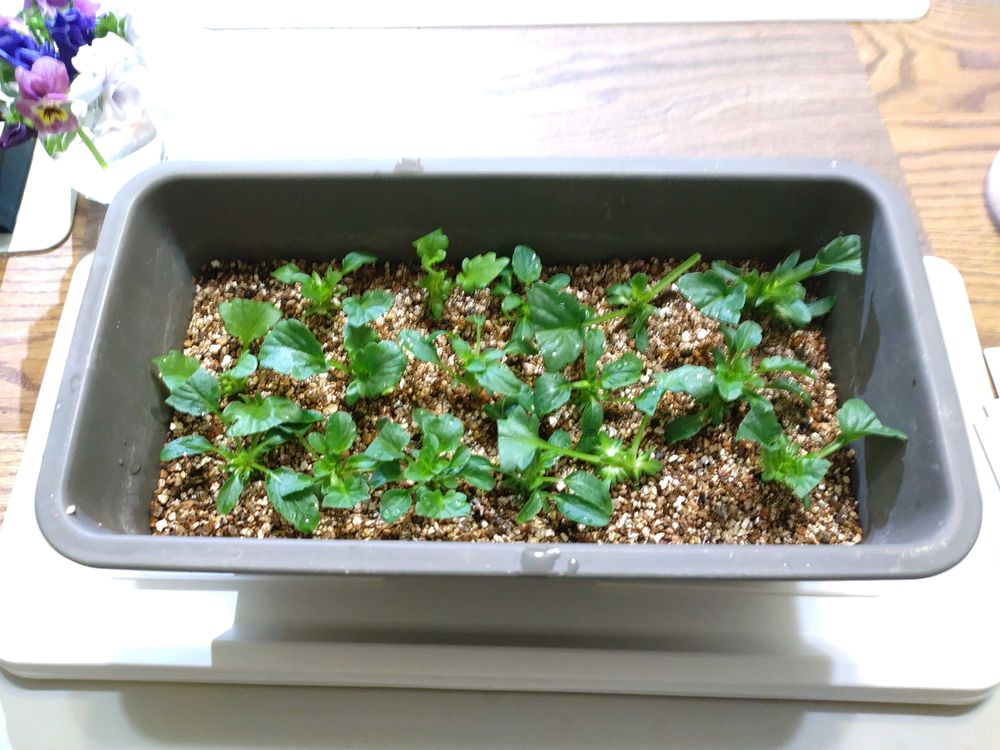 パンジーとビオラ各種の挿し芽する為に、泣く泣く花をカットして水差しで鑑賞し、挿し芽(pic5)も植えました😊