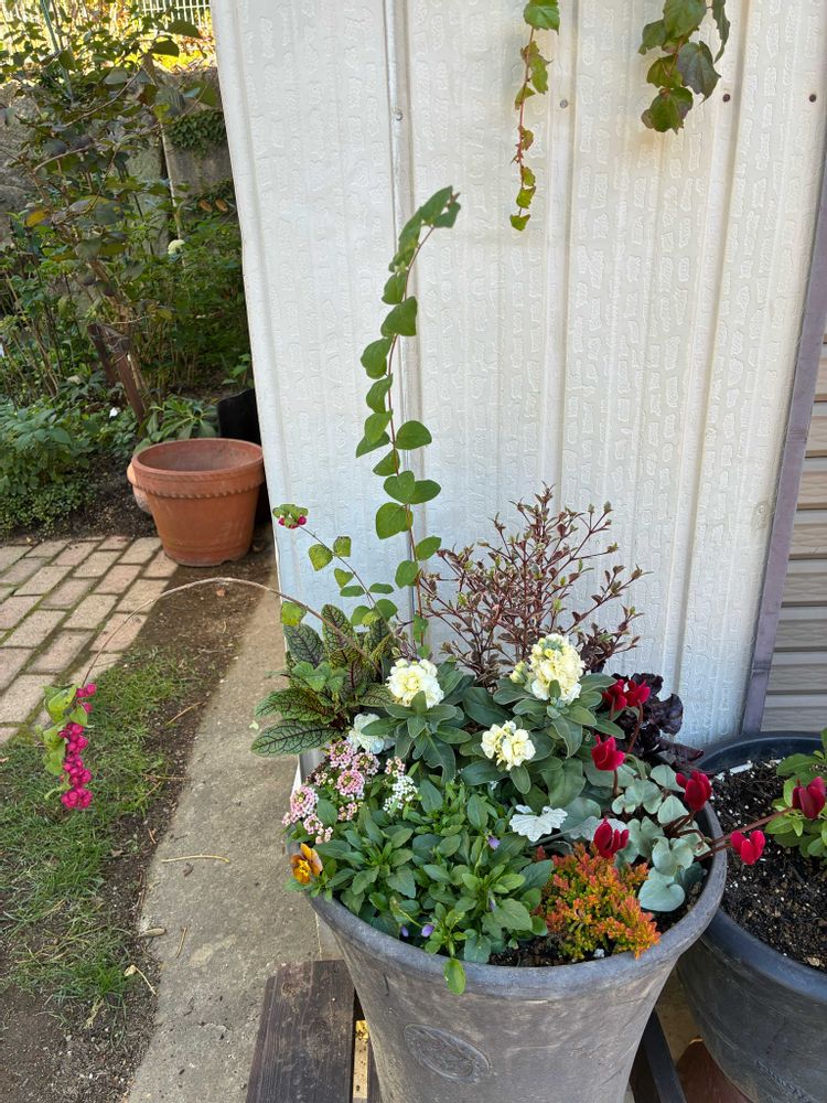 ガレージの前に置いてます。ビオラがまだ蕾なので、咲き揃うともっと華やかになるはずです。